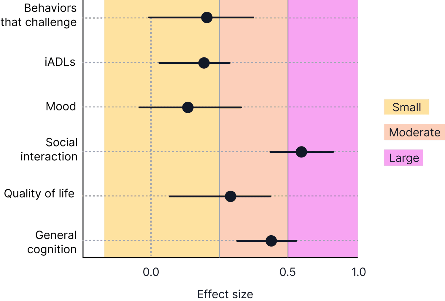 While researchers aim to see even small effects to prove efficacy, in this meta-analysis3 of 36 randomized controlled clinical trials we see sizable positive effects vs. the control across all measures, with a large effect on communication and social interaction standing out - a top priority for people living with dementia.